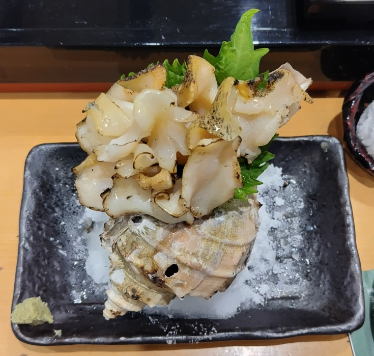 つぶ貝炙り、三重の〆鯖、大分カワハギ